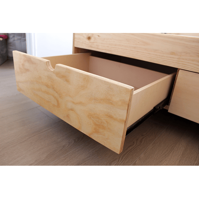 Los cajones se deslizan en correderas telescópicas de 40cm. entregando una larga vida útil y facilidad al abrir y cerrar los cajones. La estructura se fija con tornillos a la piesera y cabecera, la estructura queda sólida y firme. Su estructura interior está dividida para facilitar el transporte e instalación.